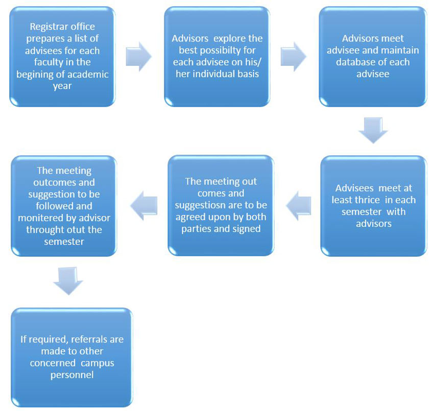 Academic Advisory System Academic Advising: College of Engineering The College of Engineering has various mechanisms of academic advising and support systems provided to assist students in achieving their educational goals. The college has established a dedicated student advisory system, called Academic Advisory System (ACADS), to monitor the academic progress and performance of students. It provides academic guidance and counselling to students in terms of academic performance, class attendance, participation in co and extracurricular activities, career opportunities and job prospects. Each student is assigned with an academic advisor who will regularly meet the student advisees, discuss student performance and identify any problems they may face. The minutes of meetings are available in the college ERPS. The academic advisory system also generates mid-semester performance reports which contain assessment outcomes and % attendance by the ninth week of the semester. Academic advisors distribute these midterm performance reports, counsel weak students whose academic progress is not satisfactory and then appropriate academic support is provided to these students by respective advisor/tutors to improve their performance in future assessments. Student Excellence Group (SEG) is an additional informal mechanism available where academically bright students are identified by tutors to provide support to weaker students in selected modules every semester. Students who are at risk of not successfully completing their programs, especially those who are not successful even after repeated attempts in the final examinations and those with an unsatisfactory overall performance are identified at the assessment boards and such cases are referred to HoDs for targeted counseling, advice and further support. Special support classes including one-to-one sessions are arranged by tutors for re-sitting students who have failed the final examination. This gives them an opportunity to refresh their understanding of topics and to clarify any doubts in the respective modules. Re-sit support class schedules are prepared and published by academic departments every semester which is communicated to staff members and students and also displayed in the college visual displays and notice boards. College of Engineering regularly evaluates the effectiveness of the academic support services offered to students through various mechanisms including surveys, feedback and input from various committees. As part of the review mechanism, regular surveys are conducted to analyse students' satisfaction with facilities such as laboratories, classrooms, library resources and IT Support. The recommendations that emerge from the analysis of these surveys are then forwarded to respective departments for their action. In addition to the surveys conducted, further feedback on various academic support services is obtained through student advisory council (SAC), student satisfaction survey (SSS), student online complaint system, student staff consultative group meetings (SSCG) and through the student representatives in various college committees such as program boards, learning and teaching committees, library advisory committee and the academic council. Student staff consultative group which is chaired by students themselves is a robust mechanism for the students to give their feedback on learning processes. This group communicates through the class representatives to collect the inputs and feedback from students from each class of different programs and levels. All the inputs and comments are collated and presented at SSCG meeting in the presence of Head of the Department, Program Leaders and Module Tutors appointed to attend the meeting. Appropriate actions are initiated on the discussion points as applicable and communicated to respective staff in-charges or concerning departments. Academic Advising: College of Pharmacy College of Pharmacy has in place a number of means for academic advising to students at various levels of Pharmacy program. The goal of academic advising is to assist students in planning meaningful academic activities to obtain the desired degree. The College of pharmacy offers Academic Advising to its students on a fair and equitable basis by advisors who have the skills and training to provide timely academic advice. The Academic Advisor provides a personal and supportive environment in which students can pursue their educational goals.
