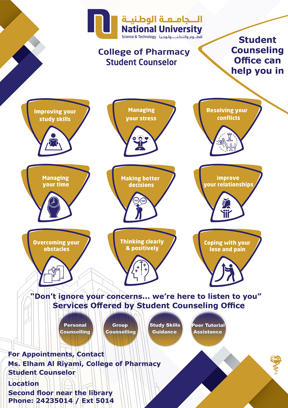 The Office provides personal counseling mainly. However, your counselor can help you explore your personal goals and interests. This self-knowledge should help you decide which major to study. Your counselor can also help you locate academic counselors and can liaise with your academic advisor on academic matters.